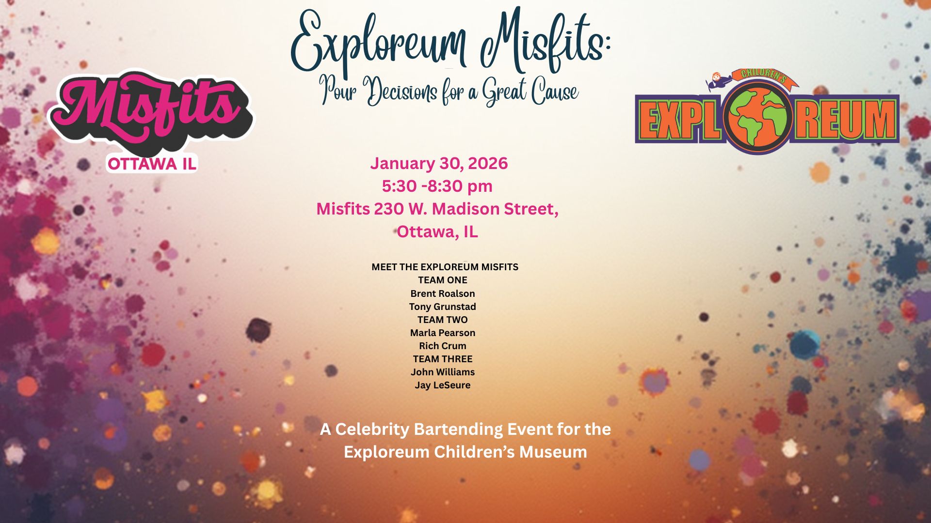 Join us at Misfits for a high-energy night as local favorites step behind the bar as our Exploreum Misfits — mixing drinks, serving smiles, and shaking things up to support the Ottawa Exploreum Children’s Museum.